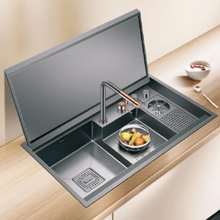 துல்லியமான கைவினைத்திறன்: எங்கள் தொழிற்சாலையில் துல்லியமாக வடிவமைக்கப்பட்ட, ஸ்மார்ட் ஃபிளிப்-டாப் சின்க் தரம் மற்றும் புதுமைக்கான எங்கள் உறுதிப்பாட்டை பிரதிபலிக்கிறது. மறைக்கப்பட்ட வடிவமைப்பு ஒரு ஒத்திசைவான மற்றும் ஸ்டைலான சமையலறை அழகியலுக்காக தடையின்றி ஒருங்கிணைக்கப்பட்டுள்ளது.